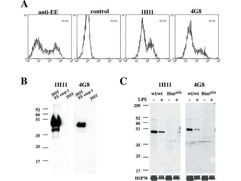 - Recognizes an epitope within the p20 fragment of mouse caspase-1. Detects a band of ~45 kDa by Western blot. Does not cross-react with mouse caspase-11 or -12. Species Reactivity: Mouse. Other species not tested.