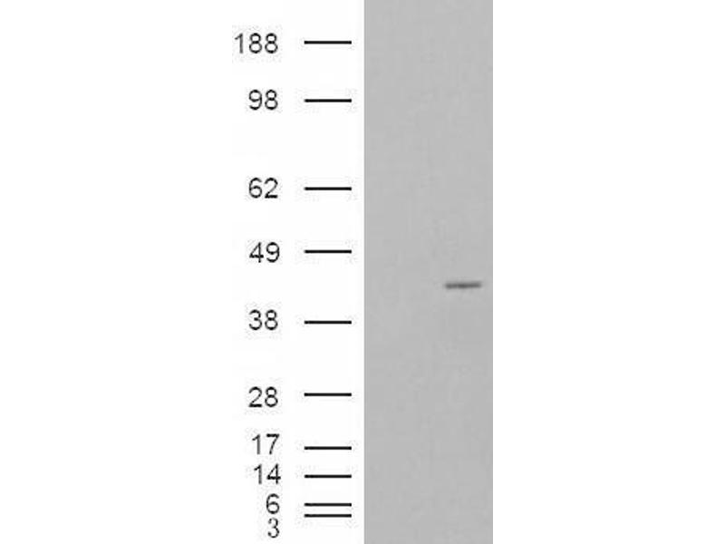 Western Blot: Approx. 38 kDa band observed in lysates of cell line Daudi (calculated MW of 39.0 kDa according to NP_000622.2 and 38.8 kDa according to NP_038202.1). In transfected HEK293 transiently expressing P40PHOX a band of approx. 42 kDa is observed. Th