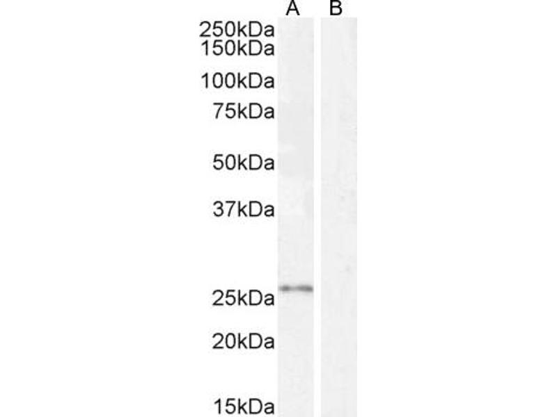 Western Blot: Approx 26 kDa band observed in lysates of cell line HeLa, which was successfully blocked by incubation with the immunizing peptide (calculated MW of 28.7 according to NP_005542.1 and 24.7 kDa according to NP_001002231.1 ). Recommended concen