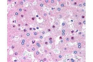 Immunohistochemistry: In paraffin embedded Human Liver shows staining of nucleoli in select hepatocytes. Recommended concentration, 2.5 μg/mL.