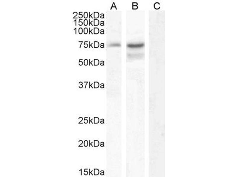 Western Blot: Approx 75 kDa band observed in lysates of cell lines HepG2 and U251 (calculated MW of 77.2 kDa according to NP_001014841.1). An additional band of unknown identity was also observed in U251 lysates at 55 kDa. This band was successfully blocke