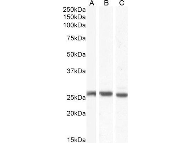Western Blot: Approx 25-26 kDa band observed in Human Colon, Prostate and Skin , Mouse Brain and in Mouse and Rat Heart lysates (calculated MW of 26.2 kDa according to Human NP_003995.2 and 26.4 kDa according to Mouse NP_032151.1 and Rat NP_001004099.1 )