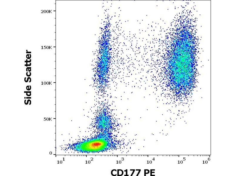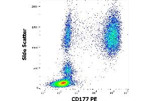 The antibody MEM-166 reacts with CD177 (Neutrophil specific antigen 1), a 60 kDa GPI-linked cell surface glycoprotein of uPAR family, expressed on granulocytes and in bone marrow early erythroblasts, megakaryocytes, promyelocytes and myelocytes.