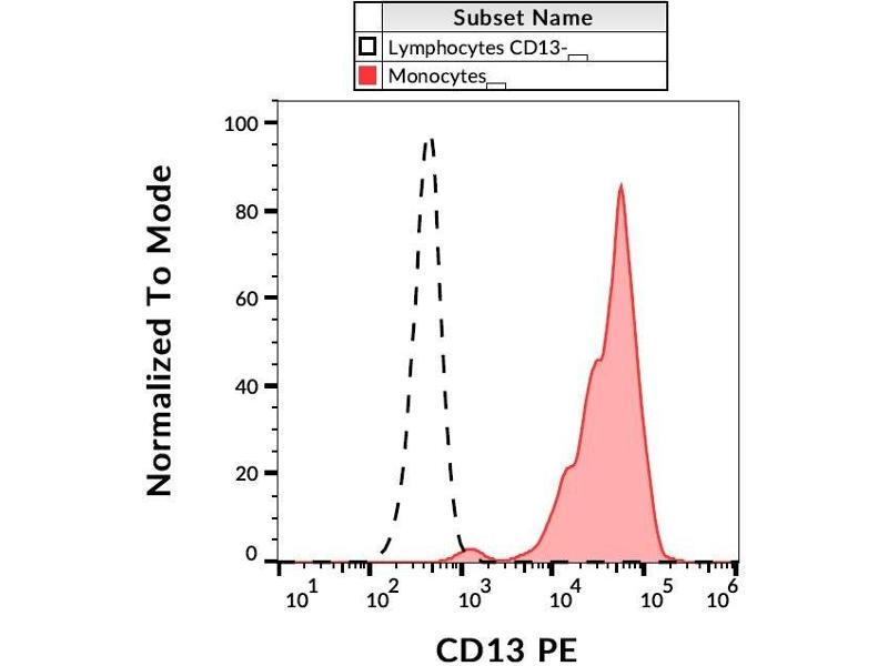 The PE-conjugated Mouse Monoclonal anti-CD13 antibody (Clone WM15) (ABIN192306) specifically detects CD13 in FACS.