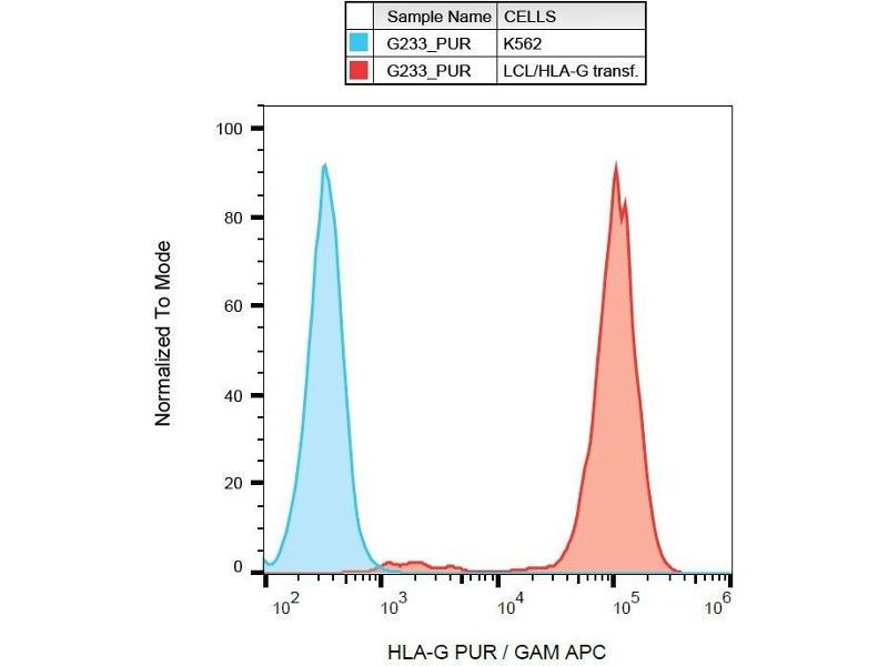 The mouse monoclonal antibody G233 recognizes an extracellular epitope on several isoforms of HLA-G expressed in all populations of extravillous trophoblast (cell columns, interstitial trophoblast, endovascular trophoblast, placental bed giant cells). HLA-G belongs to the nonclassical MHC Class I molecules (MHC Class Ib). The antibody G233 has been found not to cross-react with any other MHC Class I antigens (HLA-A, -B, -C, -E, -F).