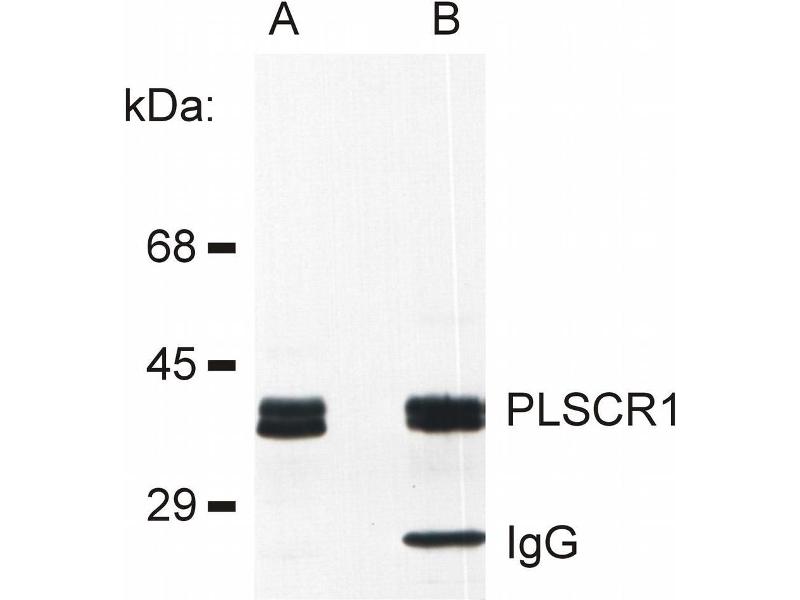 The Mouse Monoclonal anti-PLSCR1 antibody (Clone 13A6 [TEC-23]) (ABIN192390) specifically detects PLSCR1 in WB, IP, FACS and ICC.