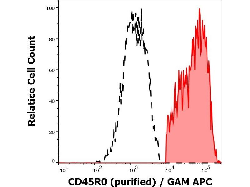 The antibody UCHL1 recognizes an extracellular epitope of CD45R0, a 180 kDa low molecular weight isoform of the leukocyte common antigen (LCA). The antigen is expressed on a subset of memory/activated T cells and on cortical thymocytes.