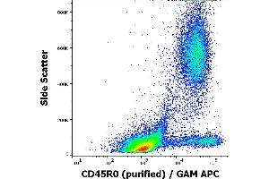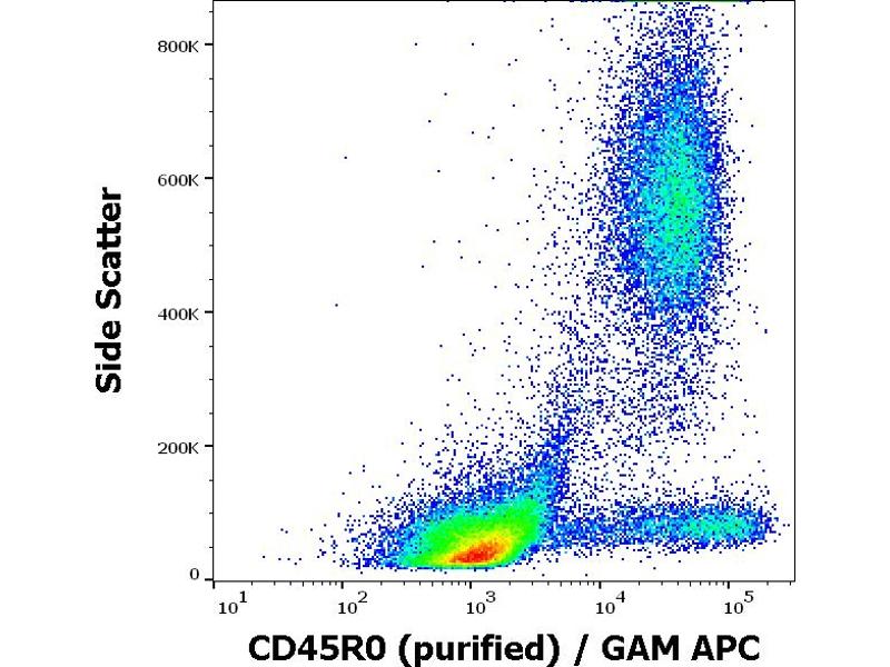CD45R0 is the shortest isoform of a receptor-type protein tyrosine phosphatase, CD45 glycoprotein. CD45 is crucial in lymphocyte development and antigen signaling, serving as an important regulator of Src-family kinases, promotes cell survival by modulating integrin-mediated signal transduction pathway and is also involved in DNA fragmentation during apoptosis. CD45 isoforms differ in their extracellular domains, whereas they share identical transmembrane and cytoplasmic domains. These isoforms differ in their ability to translocate into the glycosphingolipid-enriched membrane domains and their expression depends on cell type and physiological state of the cell. CD45R0 is expressed e.g. on macrophages, CD8+ T cells, activated T cells and myeloma cells.,PTPRCR, T200R0