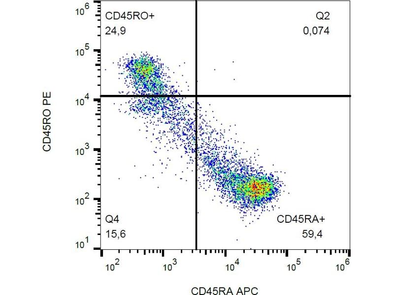 The antibody UCHL1 recognizes an extracellular epitope of CD45R0, a 180 kDa low molecular weight isoform of the leukocyte common antigen (LCA). The antigen is expressed on a subset of memory/activated T cells and on cortical thymocytes.
