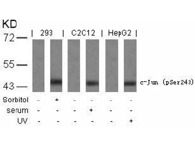 - C-Jun (phospho-Ser243) antibody detects endogenous levels of c-Jun only when phosphorylated at serine 243.