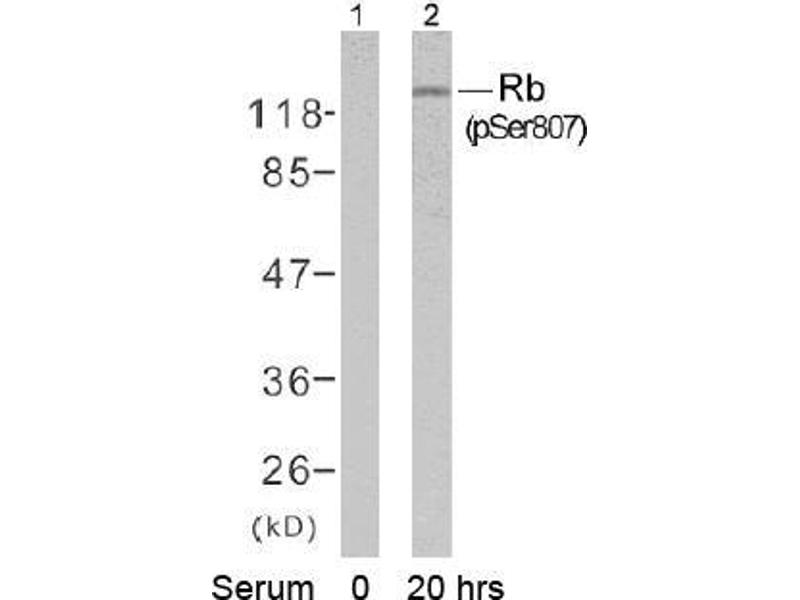 The antibody was affinity-purified from rabbit antiserum by affinity-chromatography using epitope-specific phosphopeptide. The antibody against non-phosphopeptide was removed by chromatography using non-phosphopeptide corresponding to the phosphorylation site. Rb (phospho-Ser807) antibody detects endogenous levels of Rb only when phosphorylated at serine 807.