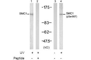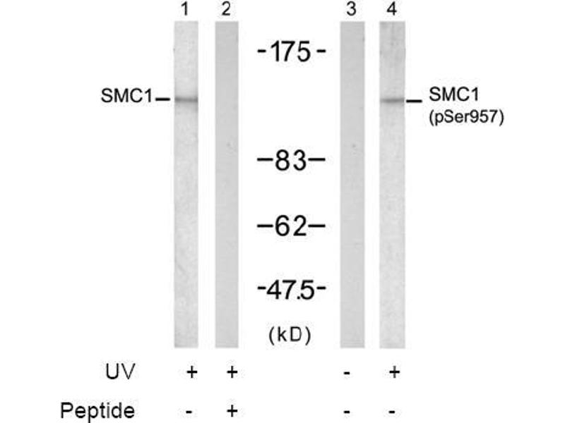 The antibody was affinity-purified from rabbit antiserum by affinity-chromatography using epitope-specific phosphopeptide. The antibody against non-phosphopeptide was removed by chromatogramphy using non-phosphopeptide corresponding to the phosphorylation site. SMC1 (phospho-Ser957) antibody detects endogenous levels of SMC1 only when phosphorylated at serine 957.