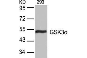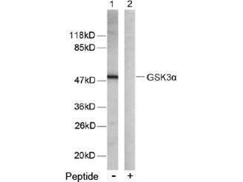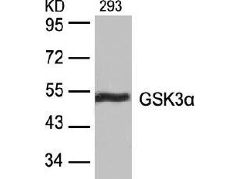 Glycogen synthase kinase 3 alpha belongs to the Ser/Thr family of protein kinases, Cdc2/cdkx subfamily, GSK3 subsubfamily. It is implicated in the hormonal control of several regulatory proteins including glycogen synthase, myb, and the transcription factor c jun. GSK3 phosphorylates glycogen synthase and thereby inactivates it. Insulin stimulates the dephosphorylation of glycogen synthase at the sites phosphorylated by GSK3 and subsequently inhibits GSK3 acutely leading to the stimulation of glycogen synthesis. GSK3 signaling is performed by two isoforms, GSK3 alpha and GSK3 beta. The two isoforms share 97 % sequence similarity within their catalytic domains. GSK3 has also been shown to play a role in protein synthesis, cell adhesion, cell proliferation, cell differentiation, microtubule dynamics and cell motility.Synonyms: Factor A, GSK-3 alpha, GSK3A, Glycogen synthase kinase-3 alpha