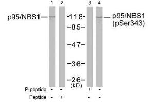 The antiserum was produced against synthesized non-phosphopeptide derived from human p95/NBS1 around the phosphorylation site of Serine 343 (S-L-SP-Q-G).