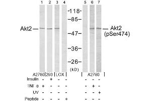 The antiserum was produced against synthesized non-phosphopeptide derived from human Akt2 around the phosphorylation site of serine 474 (Q-F-Sp-Y-S).