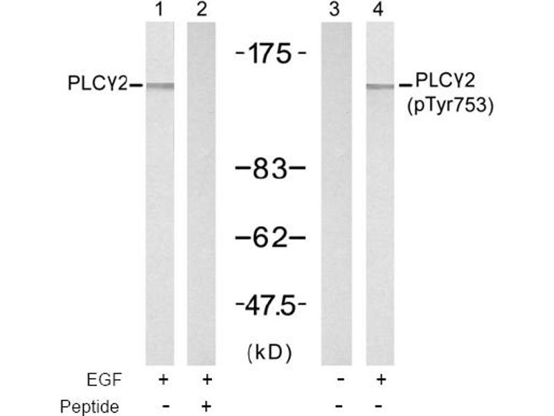 The antiserum was produced against synthesized non-phosphopeptide derived from human PLCgamma2 around the phosphorylation site of tyrosine 753 (S-L-Yp-D-V).