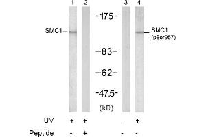 The antiserum was produced against synthesized non-phosphopeptide derived from human SMC1 around the phosphorylation site of serine 957 (G-S-Sp-Q-G).