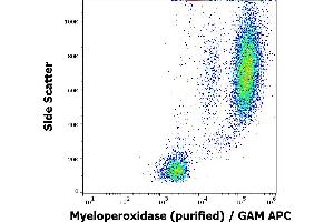 - Myeloperoxidase,Myeloperoxidase (MPO) is a heme enzyme that is localized in azurophilic (primary) granules of myeloid cells and its synthesis occurs at an early stage of differentiation. The mature myeloperoxidase is a tetramer composed of two light (12 kDa) and two heavy (60 kDa) chains. This enzyme uses hydrogen peroxide to oxidize numerous substrates, including serotonin, melatonin or chloride, to produce reactive free radicals that contribute to immune reactions of myeloid cells against pathogens. Myeloperoxidase functions not only in host defense by mediating efficient microbial killing but also can contribute to progressive tissue damage in chronic inflammatory states such as atherosclerosis or acute pancreatitis.,MPO