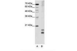 Synthetic peptide located between aa33-82 of human MAFF (Q9ULX9). Percent identity by BLAST analysis: Human, Chimpanzee, Gorilla, Gibbon, Monkey, Galago, Marmoset, Mouse, Rat, Hamster, Elephant, Panda, Dog, Bovine, Bat, Rabbit, Horse, Pig, Opossum, Guinea pig, Turkey, Zebra finch, Chicken, Platypus, Lizard, Xenopus, Salmon, Stickleback, Zebrafish, Sea squirt, Drosophila, Beetle (100%), Newt, Seabass (92%).