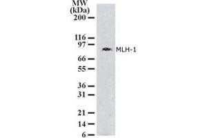This antibody was generated by immunizing mice with a synthetic peptide corresponding to amino acids 387-403 DSREQKLDAFLQPLSKP of human MLH1, GenBank no. NP_000240.1. This peptide sequence is 93% homologous to mouse and dog MLH1. Percent identity by BLAST analysis: Human, Gorilla, Monkey, Marmoset (100%), Gibbon (94%), Elephant, Panda, Bat, Dog, Rabbit (88%), Mouse, Hamster, Bovine, Horse, Pig, Opossum, Turkey, Chicken, Lizard, Xenopus (82%).