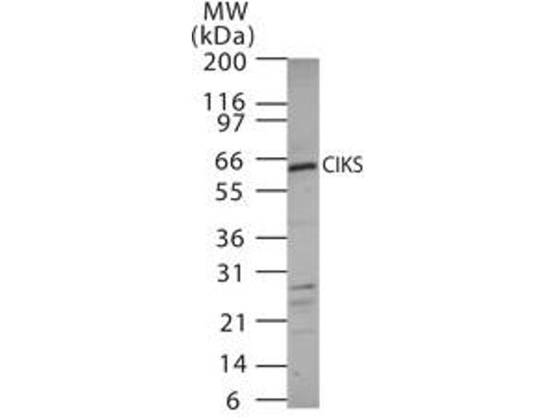 This antibody was developed against a synthetic peptide (QDLPRPLRSREFPQFEP) corresponding to amino acids 225-241 of human CIKS, GeneID: 10758 TRAF3IP2 It will cross react with mouse and rat CIKS. Percent identity by BLAST analysis: Human, Gorilla, Monkey, Marmoset, Panda (100%), Gibbon, Dog, Elephant (94%), Bovine, Hamster, Horse (88%), Mouse, Rat, Bat, Pig (82%).