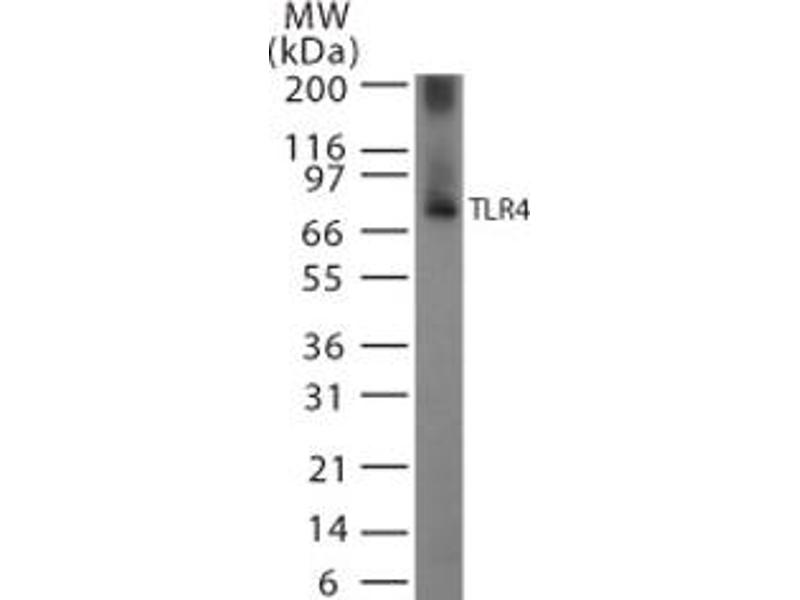 This antibody was developed against a synthetic peptide corresponding to amino acids 420-435(GLEQLEHLDFQHSNLK) of human TLR4. Percent identity by BLAST analysis: Human, Chimpanzee, Gorilla, Orangutan, Baboon, Monkey, Marmoset, Dolphin (100%), Gibbon, Sheep, Bovine, Goat, Horse, Zebu (94%), Cat, Hamster, Panda, Pig (88%), Mouse, Rat, Dog (81%).