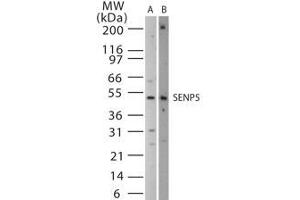 - A 50 kD band is observed. Molecular weights observed may vary, depending isoform(s) present in the lysate. should recognize SENP5 isoforms containing the immunogen sequence (CNRKPFINREITNYRARH) used to make the antibody. Isoform sizes from 163-755 amino acids have been described for SENP5.