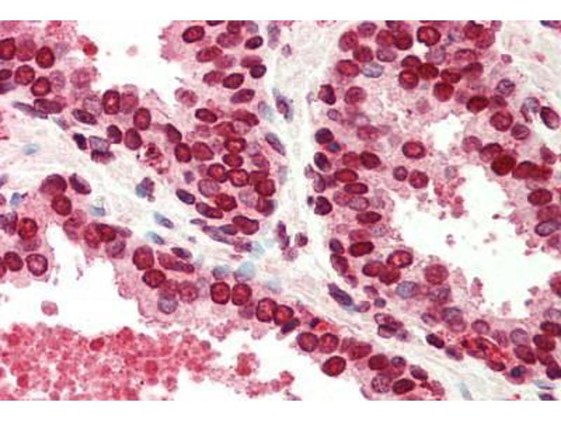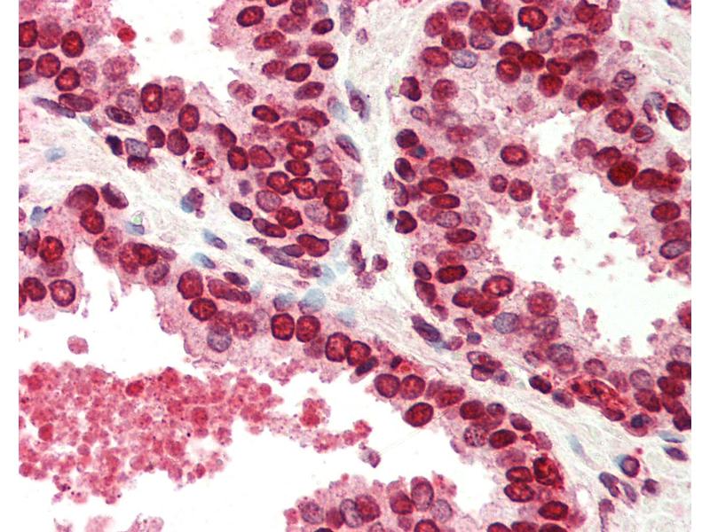 Usage: Immunohistochemistry: This antibody was validated for use in immunohistochemistry on a panel of 21 formalin-fixed, paraffin-embedded (FFPE) human tissues after heat induced antigen retrieval in pH 6.0 citrate buffer. After incubation with the primary antibody, slides were incubated with biotinylated secondary antibody, followed by alkaline phosphatase-streptavidin and chromogen. The stained slides were evaluated by a pathologist to confirm staining specificity. The optimal working concentration for this antibody was determined to be 2.5 μg/mL. -