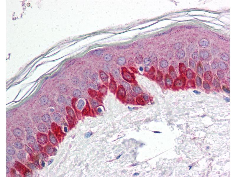 Usage: Immunohistochemistry: This antibody was validated for use in immunohistochemistry on a panel of 21 formalin-fixed, paraffin-embedded (FFPE) human tissues after heat induced antigen retrieval in pH 6.0 citrate buffer. After incubation with the primary antibody, slides were incubated with biotinylated secondary antibody, followed by alkaline phosphatase-streptavidin and chromogen. The stained slides were evaluated by a pathologist to confirm staining specificity. The optimal working concentration for this antibody was determined to be 5 μg/mL. -
