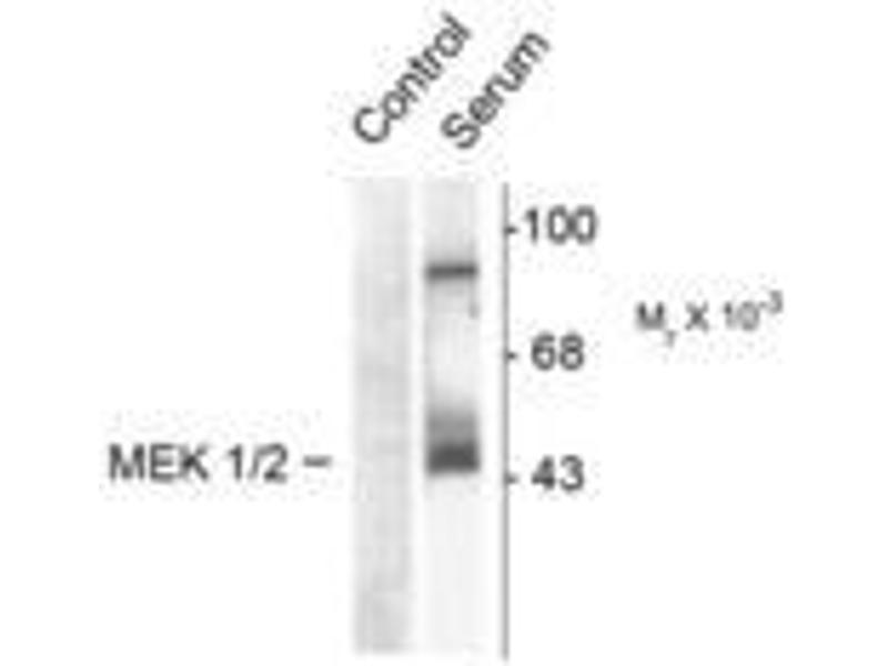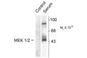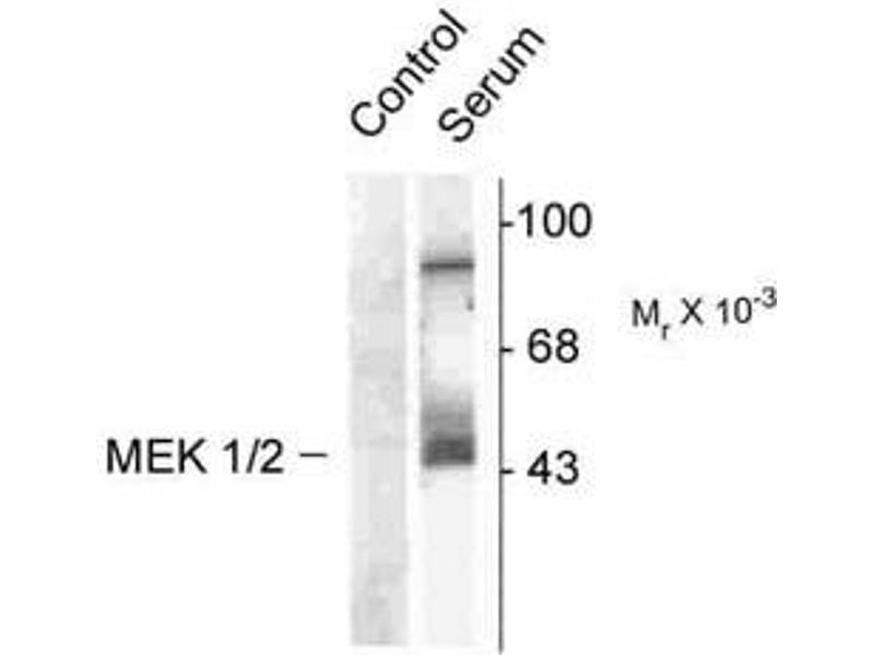 - Specific for the ~45k MEK 1/2 protein phosphorylated at Ser218/222 in Western blots. Immunolabeling is blocked by the phosphopeptide used as the antigen but not by the corresponding dephosphopeptide