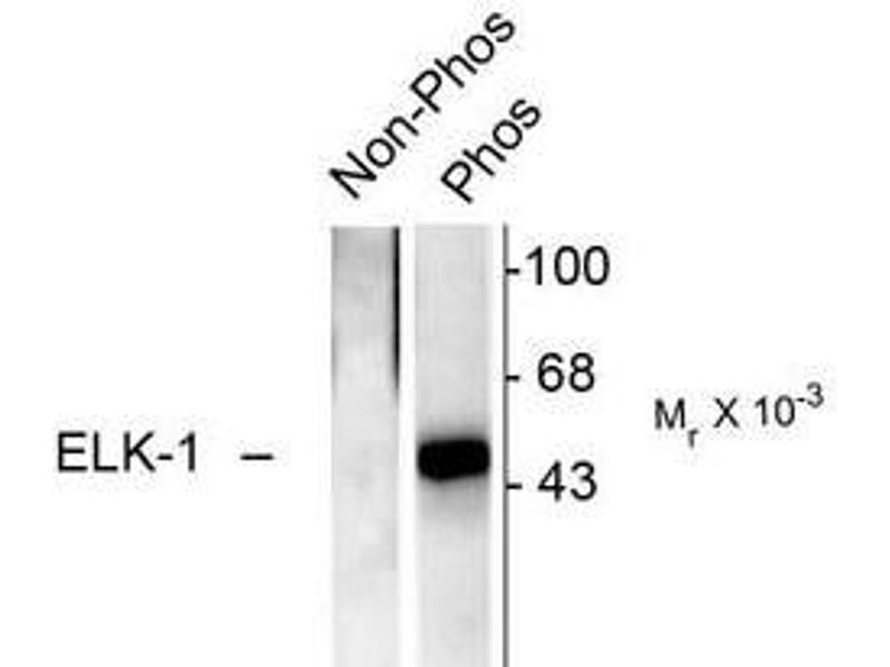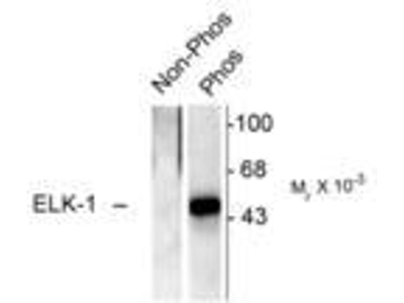 - Specific for ~46k Elk-1 phosphorylated at Ser383. Immunolabeling is blocked by the phosphopeptide used as antigen but not by the corresponding dephosphopeptide