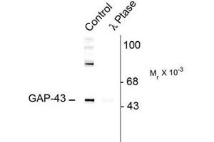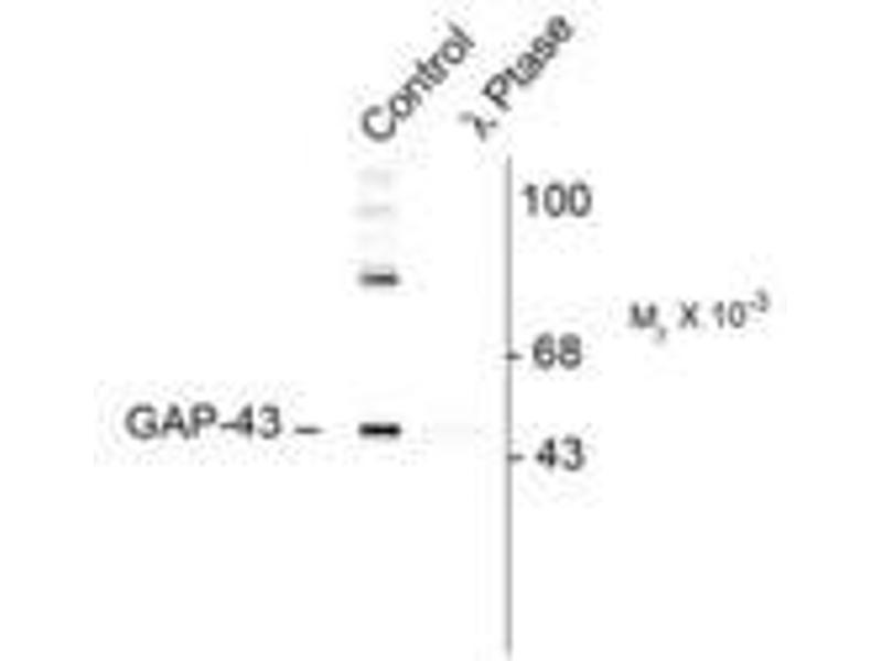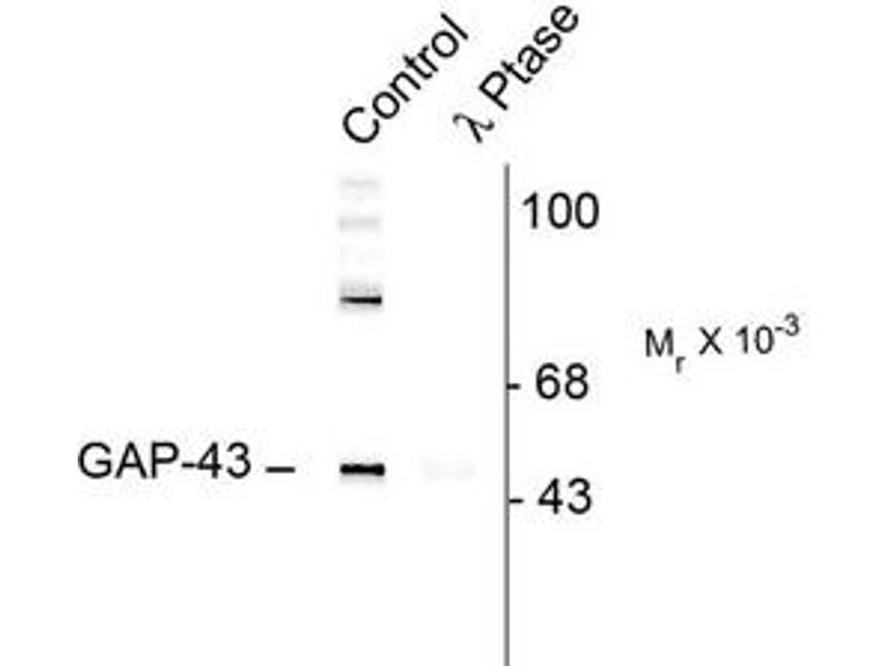 - Specific for the ~50k Gap-43 protein phosphorylated at Ser41. In some tissues the antibody also recognizes a higher molecular weight protein that is also recognized by the pan Gap-43 antibody, that may be a Gap-43 aggregate or oligomer. Immunolabeling is blocked by the phosphopeptide used as antigen but not by the corresponding