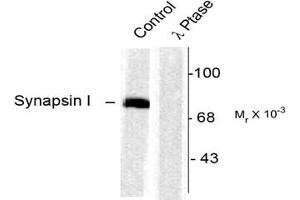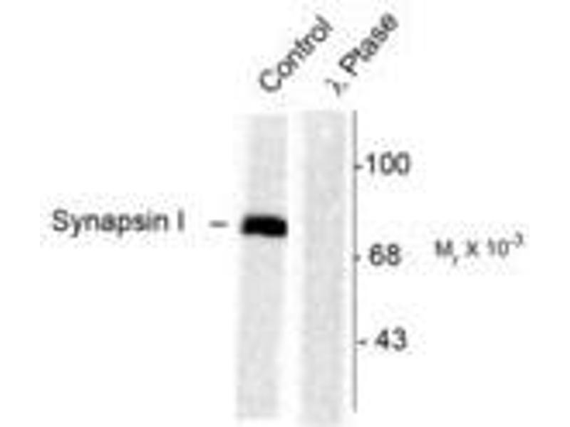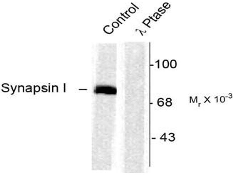 - Specific for ~78k synapsin I doublet protein phosphorylated at Ser603. Immunolabeling of the synapsin I band is blocked by a,-phosphatase treatment
