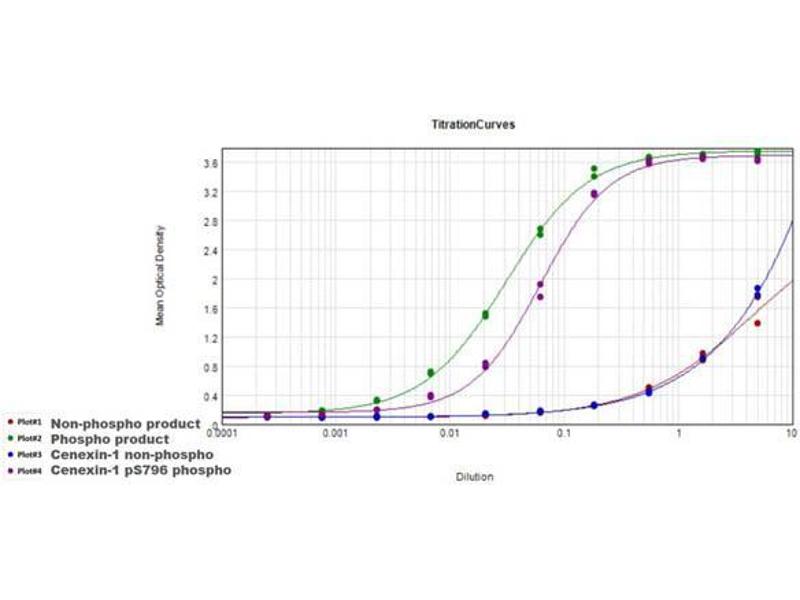 Application Note: This affinity purified antibody has been tested for use in ELISA and western blotting. Specific conditions for reactivity should be optimized by the end user. Expect a band approximately 93 kDa in size corresponding to phosphorylated Cenexin-1 by western blotting in the appropriate cell lysate or extract. This phospho-specific polyclonal antibody reacts with human Cenexin-1 pS796 and shows minimal reactivity by ELISA against the non-phosphorylated form of the immunizing peptide.