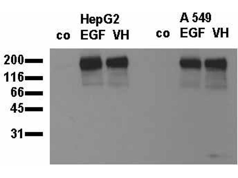 - Immunoblotting: 0.1 µg/mL for HRP/ECL detection. Recommended blocking buffer CPPT: 0.5 % (w/v) casein, 5 % (w/v) PEG 4000, 5 % (w/v) Polyvinylpyrrolidone (PVP), 0.5 % Tween 20, 10mM Tris/HCl, pH 7.4, 150mM Sodium Chloride. Phosphospecificity Whole cell extracts of control (co), EGF stimulated (EGF) or pervanadate treated (VH) HepG2 and A549 tumor cells were applied to SDS-PAGE (20.000 cells per lane) and transferred to a PVDF membrane. The blot was probed with 0.5- g/mL ABIN235076 for 1 hour at RT and developed by ECL (exp. time: 30 sec). ELISA: 0.1 µg/mL Each laboratory should determine an optimum working titer for use in its particular application. Other applications have not been tested but use in such assays should not necessarily be excluded.