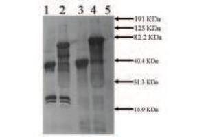 Suitable for use in ELISA and Western blot (1-5 µg/mL). Each laboratory should determine an optimum working titer for use in its particular application. Other applications have not been tested but use in such assays should not necessarily be excluded. Rabbit anti Mouse tPA (2 µg/mL) Secondary: anti Rabbit IgG ABC Kit Lane 1: 0.5ug mouse tPA (non-reduced) Lane 2: 0.5ug mouse tPA + 3ug CPAI (non-reduced) Lane 3: 0.5ug mouse tPA (reduced) Lane 5: Molecular weight standards