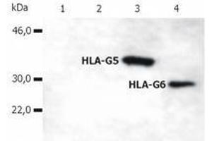 Western Blotting (Reducing Conditions): 12 % AA SDS-PAGE. Positive Control: JEG-3 cell lysate. Flow Cytometry. Immunohistochemistry on Paraffin and Frozen Sections: 10-20 μg/mL. Positive tissue: placenta tissue. Immunocytochemistry. ELISA: The antibody 5A6G7 has been tested as the capture antibody in a sandwich ELISAfor analysis of soluble HLA-G in combination with antibody ABIN238525. Positive Control: HeLa/HLA-G5 transfectants cell lysate. HeLa/HLA-G5 cell supernatant. Negative Control: HeLa cell lysate. Other applications not tested. Optimal dilutions are dependent on conditions and should be determined by the user.
