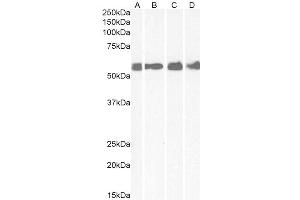 Western Blot: Approx 60 kDa band observed in Human Brain (Cerebellum), Colon, Rat Brain and Mouse spinal cord lysates (calculated MW of 47.7 kDa according to NP_004373.2). The observed molecular weight corresponds to earlier findings in literature with di