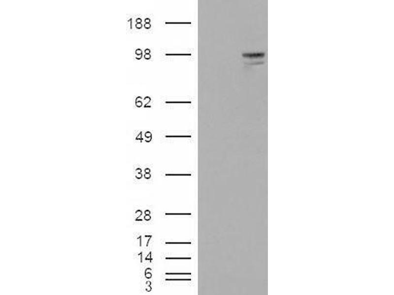 Western Blot: Approx. 85-90 kDa band observed in Human Brain (Amygdala) lysates (calculated MW of 91.6 kDa according to NP_061850.2). In transfected HEK293 transiently expressing Neuregulin3 a band of approx. 98 kDa is observed. This band is not observed in