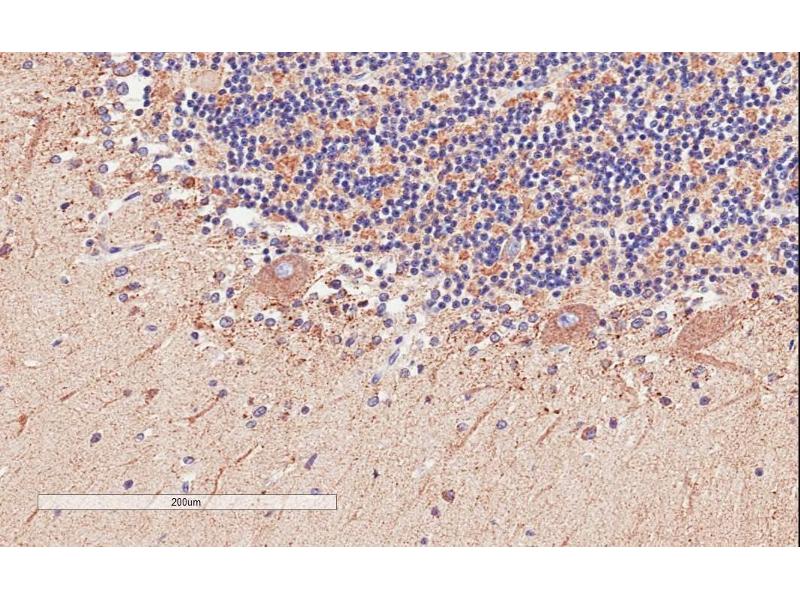 Immunohistochemistry: In paraffin embedded Human Cerebellum shows pixulated cytoplasm staining in neurons directly near the granular layer. Recommended concentration: 2-4 μg/mL.