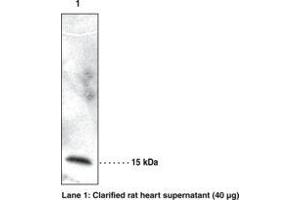 Detects both the mature protein at about 15 kDa by western blot in tissues/cells such as heart, HEK 293 cells, Cos-7 cells, and RAW 264.7 cells.
