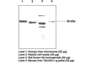Detects the enzyme at 56 kDa by western blot from tissues and cells such as brown fat, liver, mouse macrophages, and Hep-G2 cells.
