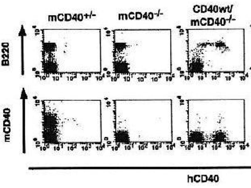 - CD40 is a 45-50- kDa glycoprotein belonging to the tumor necrosis factor (TNF) receptor superfamily. CD40 is specifically expressed on the surface of B cells and specialized antigen-presenting cells such as dendritic cells and macrophages. CD40 interacts with the CD40 ligand (CD154) which is found primarily on T cells, playing a role in both humoral and cell-mediated immune responses. Activation of CD40 on B cells by CD40 ligand causes B cell proliferation, differentiation, immunoglobulin isotype switching, germinal center formation, and stimulation of the humoral memory response. This antibody reacts with a 45-48 kDa type I integral membrane glycoprotein present on peripheral blood and tonsillar B cells, but not expressed on terminally differentiated B cells. The antibody against human CD40 was produced from hybridoma (5C3) cultured in serum-free medium and purified under mild conditions by proprietary chromatography processes.