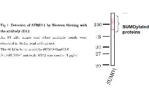 SUMO (Small Ubiquitin-like Modifier) proteins are a family of small proteins that are covalently attached to and detached from other proteins in cells to modify their function. Unlike ubiquitination, which targets proteins for degradation, SUMO modification plays a critical role in a number of cellular functions including nucleocytoplasmic transport, gene expression, cell cycle and formation of subnuclear structures such as promyelocytic leukemia (PML) bodies. There are three confirmed SUMO isoforms in human, SUMO1, SUMO2 and SUMO3. SUMO2 /3 show a high degree of similarity to each other and are distinct from SUMO1. Individual SUMO family members are all targeted to different proteins with diverse biological functions. SUMO-1 is conjugated to RanGAP, PML, p53 and IkappaB-alpha to regulate nuclear trafficking, formation of subnuclear structures, regulation of transcriptional activity and protein stability. SUMO1 is encoded as a 101 aa protein and first Met and C-terminal 4 aa are removed from the preprotein.