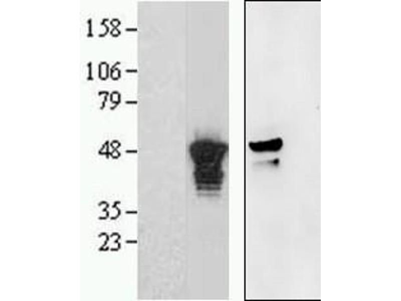 - ELISA: Antibody detection limit dilution 1:128,000. Western Blot: Approximately 45 kDa band seen in Jurkat and HeLa cell lysates. Recommended for use at 0.5-2 μg/mL.
