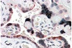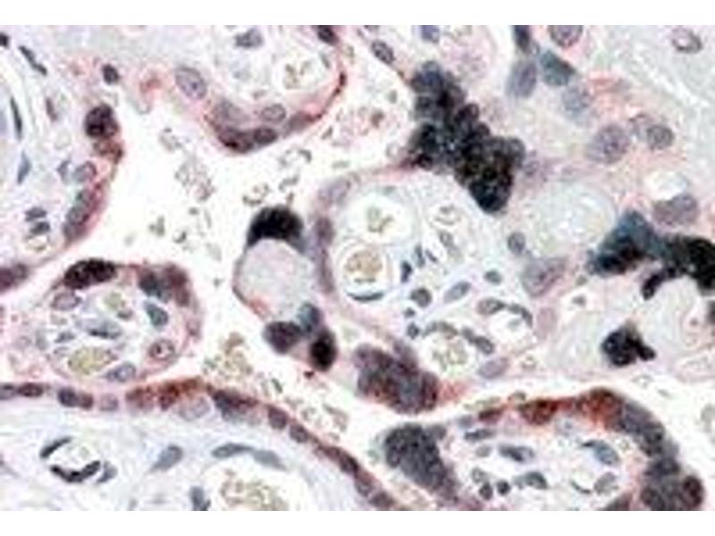 ELISA: Antibody detection limit dilution 1:16000. Western Blot: Consistent band observed in 293 and human heart at approximately 75 kDa with 1 hour incubation of primary at 0.5 μg/mL. Immunohistochemistry: In paraffin embedded human placenta shows staining of the syncytiotrophoblasts. Recommended concentration, 3-6 μg/mL.