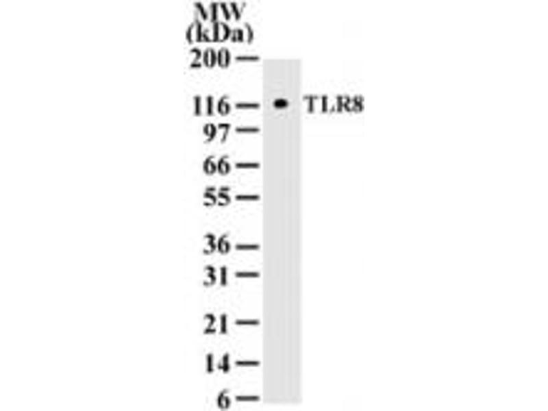 Ten human homologs of TLRs (TLR1-10) have been described. TLR8 gene contains three exons, two of which have coding function. TLR8 cDNA codes for a protein of approximate molecular weight of 120 kDa (4,5). Toll-like receptors (TLRs) are signaling molecules that recognize different microbial products during infection and serve as an important link between the innate and adaptive immune responses. These proteins act through adaptor molecules such as MyD88 and TIRAP to activate various kinases and transcription factors. Like TLR7, TLR8 is localized to endosomal or lysosomal compartments and stimulates the innate immune response after activation by guanosine- and uridine-rich single-stranded RNA. Human but not murine TLR8 confers responsiveness to the antiviral compound R-848. The protein encoded by this gene is a member of the Toll-like receptor (TLR) family which plays a fundamental role in pathogen recognition and activation of innate immunity. TLRs are highly conserved from Drosophila to humans and share structural and functional similarities. They recognize pathogen-associated molecular patterns (PAMPs) that are expressed on infectious agents, and mediate the production of cytokines necessary for the development of effective immunity. The various TLRs exhibit different patterns of expression. This gene is predominantly expressed in lung and peripheral blood leukocytes, and lies in close proximity to another family member, TLR7, on chromosome X.