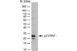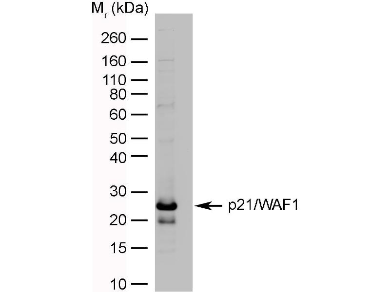 This antibody recognises the human cyclin-dependent kinase inhibitor p21/WAF1, which is an important cell cycle regulatory protein, also known as CIP1.The p21 protein inhibits cell cycle progression at both the G1 and G2 checkpoints. The expression of p21 is inducible by a wide range of stress stimuli.This antibody detects a band of approximately 21kD in MCF-7 cell lysates following UV radiation.