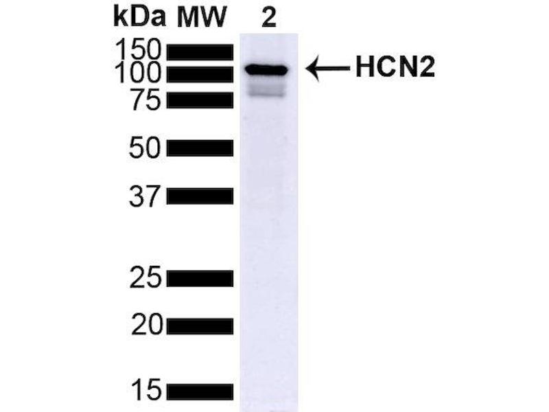1 μg/ml of ABIN2481385 was sufficient for detection of HCN2 in 10 μg of rat brain lysate by colorimetric immunoblot analysis using Goat anti-mouse IgG:HRP as the secondary antibody.