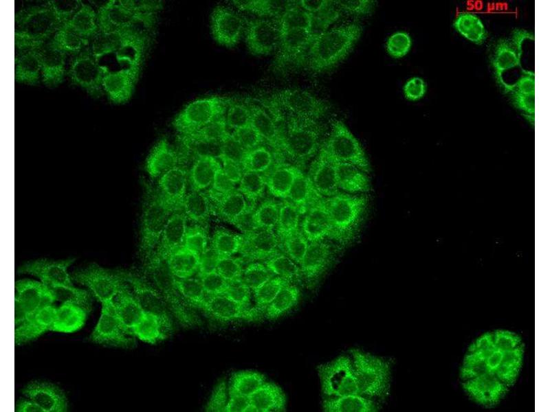 - CD74 is a non-polymorphic type II integral membrane protein. It has a short N-terminal cytoplasmic tail of 28 amino acids, followed by a single 24-aa transmembrane region and an approximately 150-aa lumenal domain (1). The CD74 chain is thought to function mainly as an MHC class II chaperone, which promotes ER exit of MHC class II molecules, directs them to endocytic compartments, prevents peptide binding in the ER, and contributes to peptide editing in the MHC class II compartment. Class II MHC and Ii expression was believed to be restricted to classical antigen-presenting cells (APC), however, during inflammation, other cell types, including mucosal epithelial cells, have also been reported to express class II MHC molecules (2). Experiments that investigate cell-surface CD74 are complicated by the fact that CD74 remains on the cell surface for a very short time. The surface half-life of CD74 was calculated to be fewer than 10 minutes (3). CD74 however has also recently been shown to have a role as an accessory-signaling molecule because of its high-affinity binding to the pro-inflammatory cytokine, macrophage migration-inhibitory factor (MIF) (3). The restricted expression of CD74 by normal tissues and its very rapid internalization make CD74 an attractive therapeutic target for both cancer and immunologic diseases (4).
